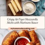 Air Fryer Mozzarella Sticks are golden and crispy on the outside with a gooey, melted mozzarella center. This easy recipe uses air frying to deliver a perfectly crunchy coating without deep frying, making it a healthier and quick appetizer option. Serve these classic cheesy sticks with marinara sauce for a delicious snack or party treat.