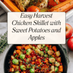 This Autumn Harvest Chicken Skillet is a cozy, one-pan dinner filled with tender chicken breasts, roasted sweet potatoes, crisp apples, and a savory maple Dijon glaze. It offers a perfect balance of sweet, savory, and hearty fall flavors, and can be prepared in under 40 minutes, making it an ideal weeknight meal.